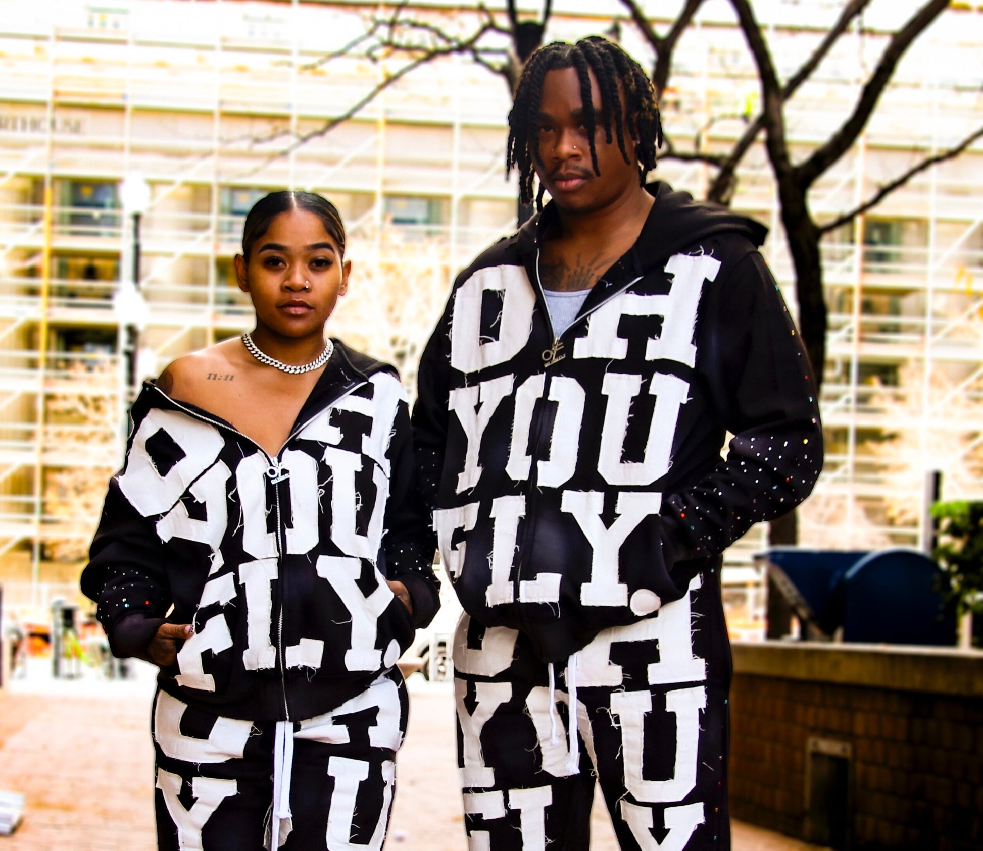 -Stay warm and stylish with our new sweatsuit. Experience a cozy fit and stand out with unique rhinestone details.